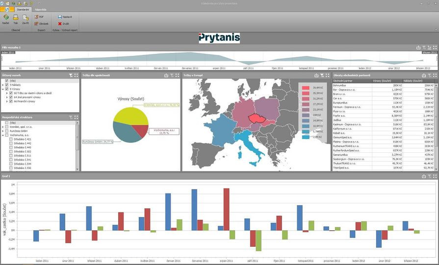 Prytanis nabízí uživatelům moduly Ekonomika, Obchod, Personalistika a mzdy, Nákladní doprava, Osobní doprava, Logistika a Zakázky. Samostatnou funkční část systému tvoří silný reportingový nástroj KYBOS, který umožňuje snadné a rychlé vytváření potřebných výstupů pro manažery. Obsahuje sadu nástrojů pro tvorbu se stav a přehledné datové výstupy.