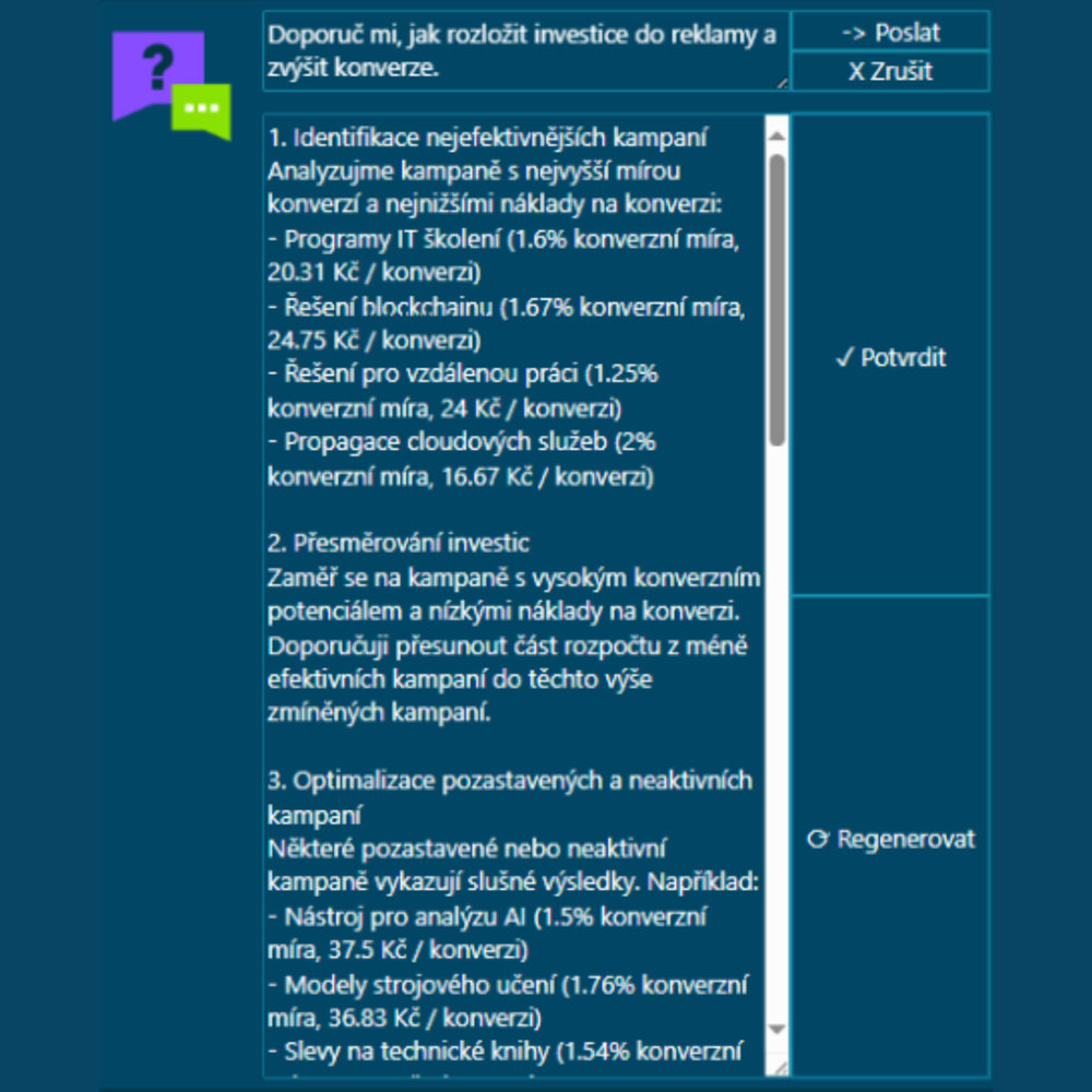 Chatbot za vás posbíraná data analyzuje, srozumitelně je vysvětlí a doporučí vám, jak zlepšit konverze nebo do jakých kanálů investovat.